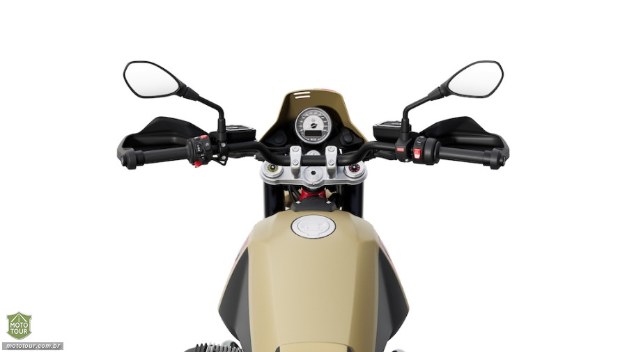 O principal destaque visual da Option 719 está na pintura exclusiva Sandrover Matt, um tom fosco que dialoga com a proposta off-road e ressalta as linhas clássicas da motocicleta. O contraste é reforçado pelo chassi em vermelho, suspensão dianteira em preto e protetores de mão também escurecidos, criando uma assinatura estética marcante e imediatamente reconhecível.