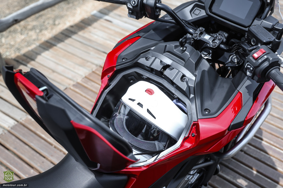 Cabe um capacete integral, documentos, câmera, luvas — tudo ao alcance da mão, agora com porta USB-C e divisória interna.